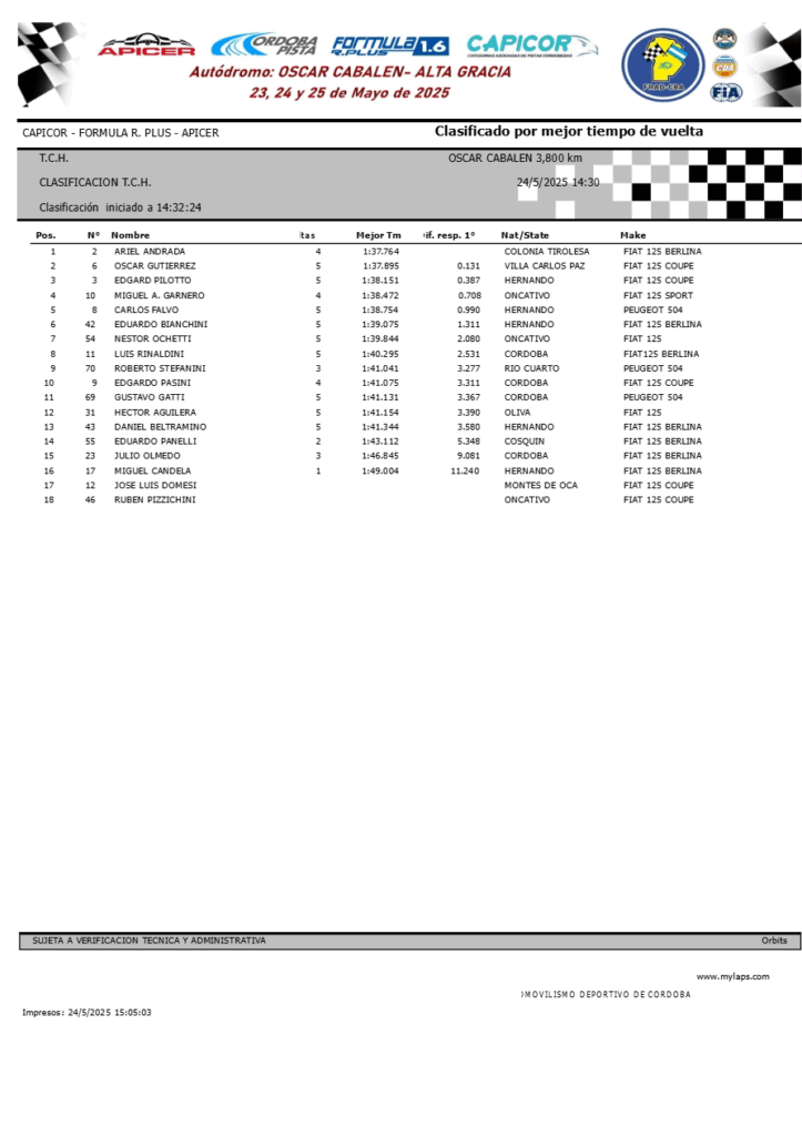 Con un agradable clima sobre la comuna de Santa Ana, comenzaron a cumplirse las clasificaciones de la tercera fecha para las cuatro divisionales de C.A.PI.COR en el Autodromo Oscar Cabalen.