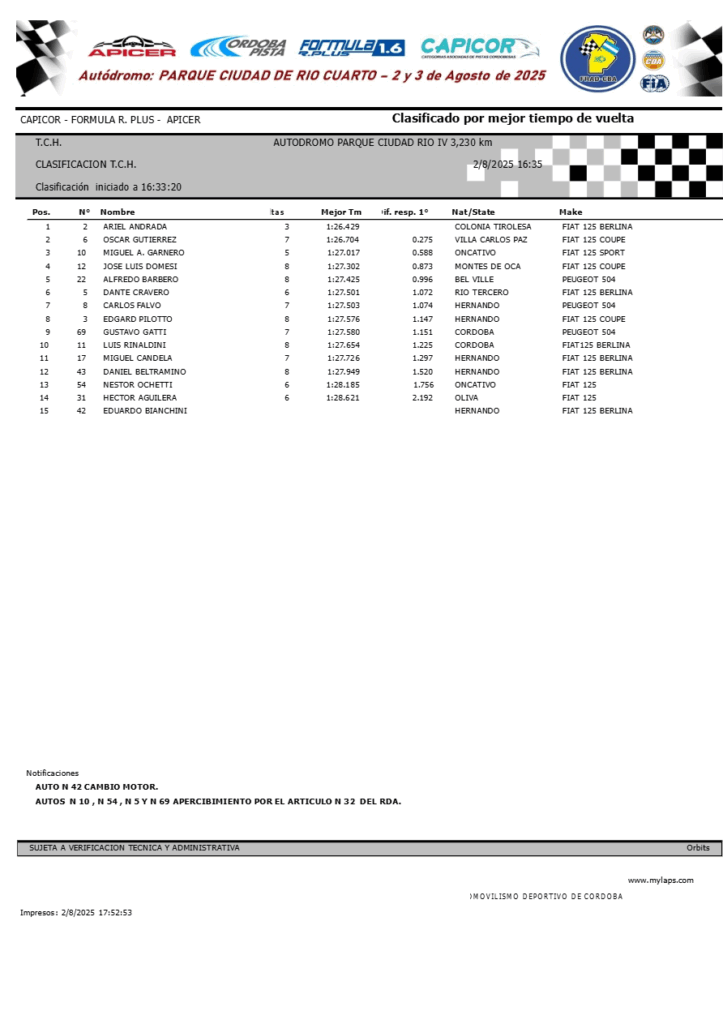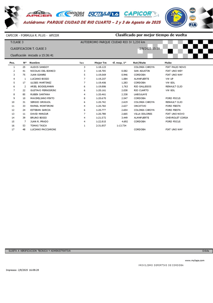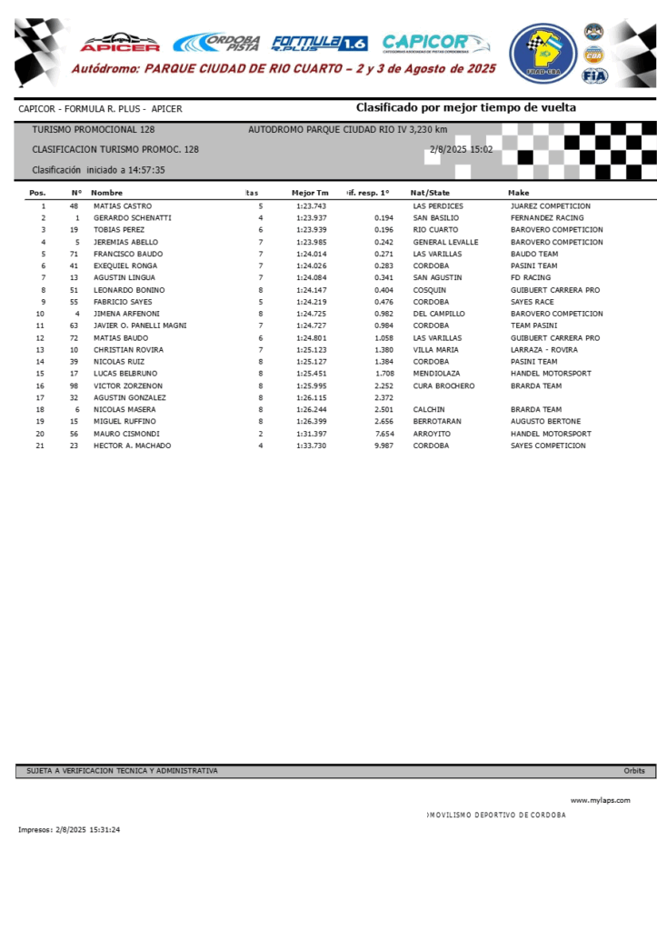 En el Turismo Promocional Matías Castro (Juárez Competición) logro su primera pole position en la divisional de 128. Por el lado del Turismo Clase 3, el integrante del BBT Motorsport, Alexis Sangoy anoto la tercera pole consecutiva del 2025.