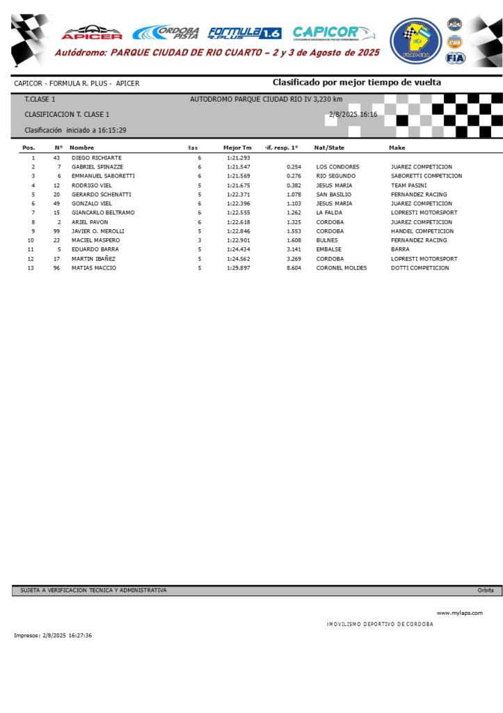 En la categoría Clase 1, Diego Richarte (Leimgruber Competición) logro el mejor registro de clasificación en su fecha incorporación a la categoría.