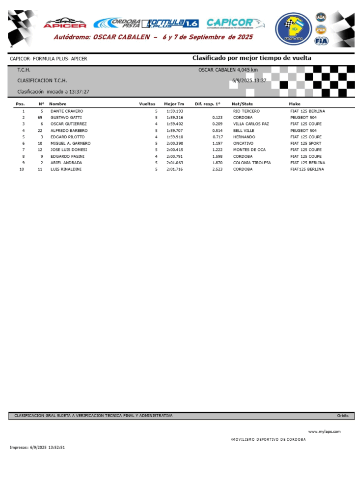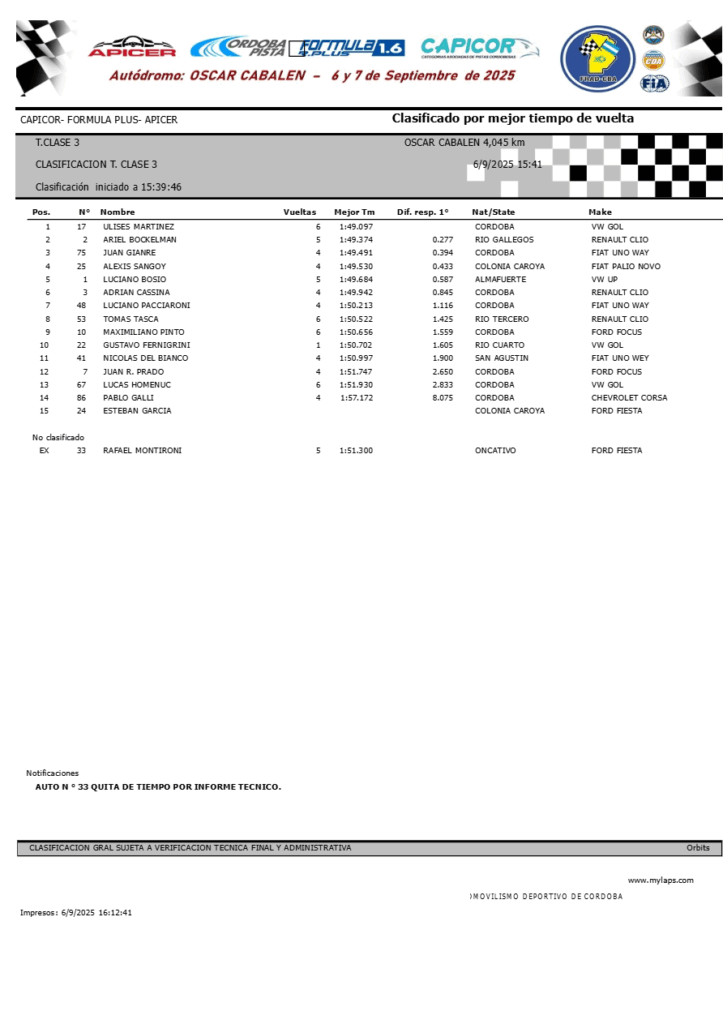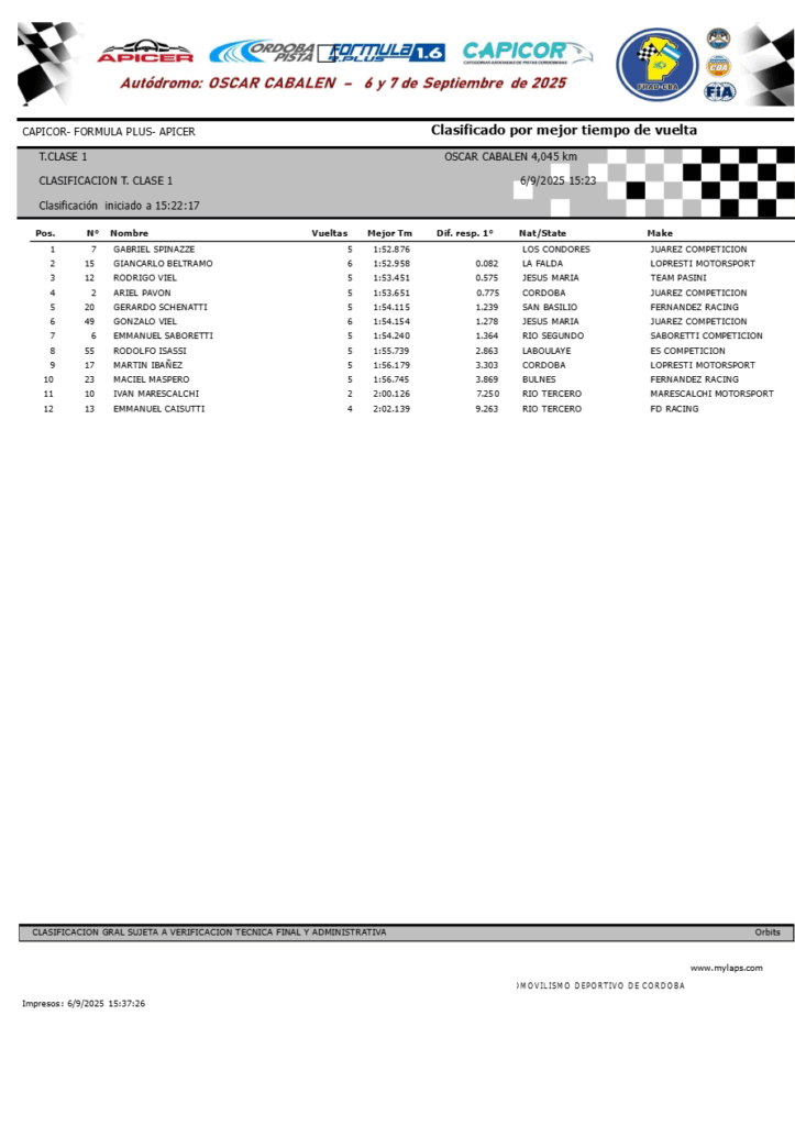 Gabriel Spinazze (Juárez Competición) se quedó con la primera pole position de la temporada dentro de la Clase 1. En la divisional Clase 3, Ulises Martínez se adjudicó la segunda pole de la temporada tras un tiempo de 1:49,097.