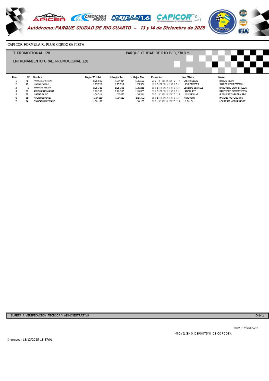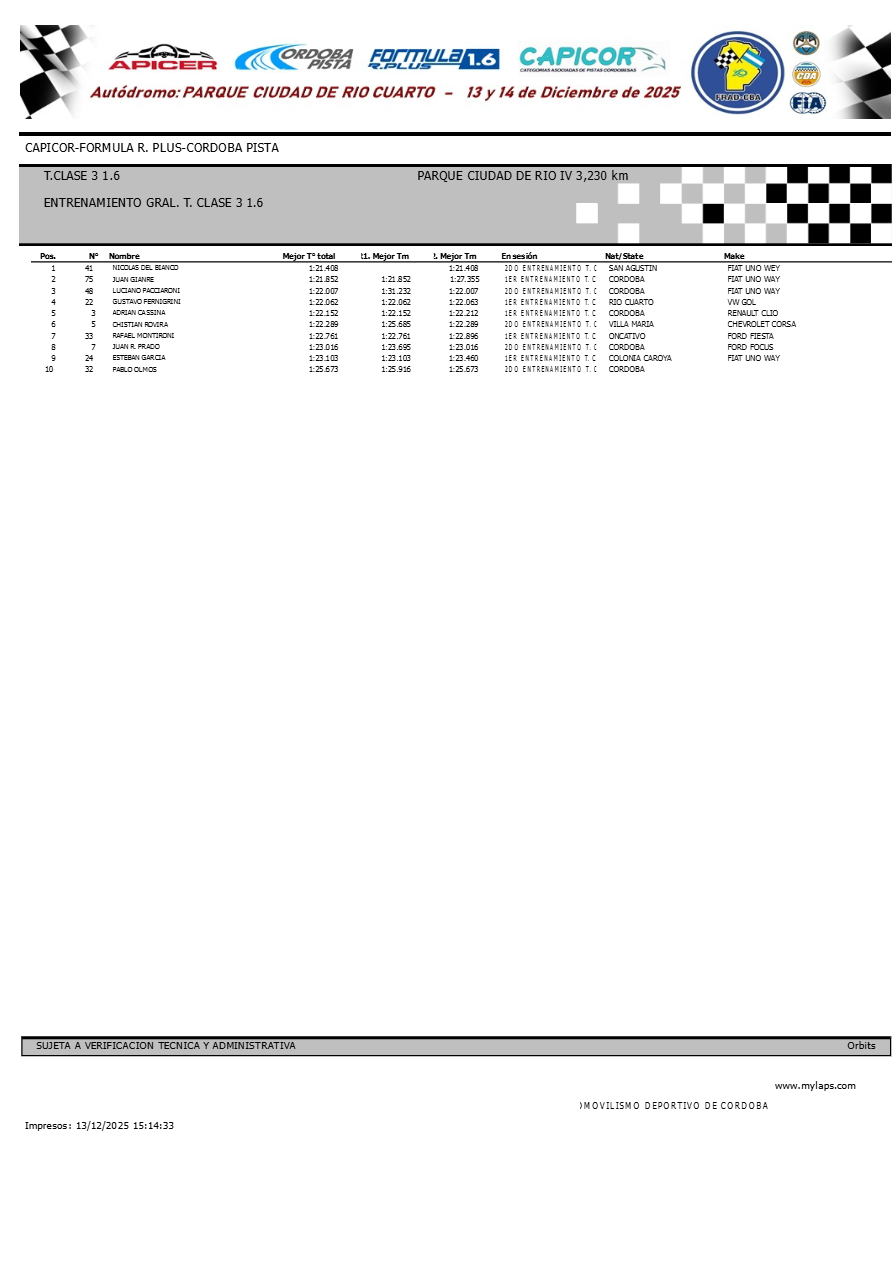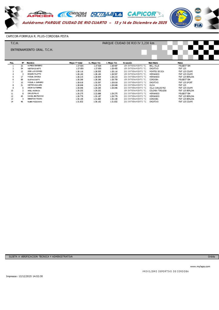 La primera jornada dio comienzo con los entrenamientos libres, donde se quedaron con los registros generales Alfredo Barbero (Turismo Cordobés Histórico), Nicolás Del Bianco (Clase 3), Gabriel Spinazze (Clase 1) y Francisco Baudo en Turismo Promocional 128.